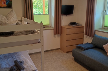 - trilo 5 60 m² - 1 ložnice s manželskou postelí, ložnice s palandou pro 2 osoby a rozkládacím gaučem pro 1 osobu, obývací pokoj s kuchyňským koutem, sociální zařízení, terasa