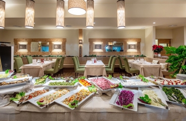 - večeře servírované menu s výběrem ze 3 teplých předkrmů a 3 hlavních jídel s přílohou, salátový bufet, servírovaný dezert, voda (0,5 l) a stolní víno (0,25 l), ostatní nápoje za poplatek
